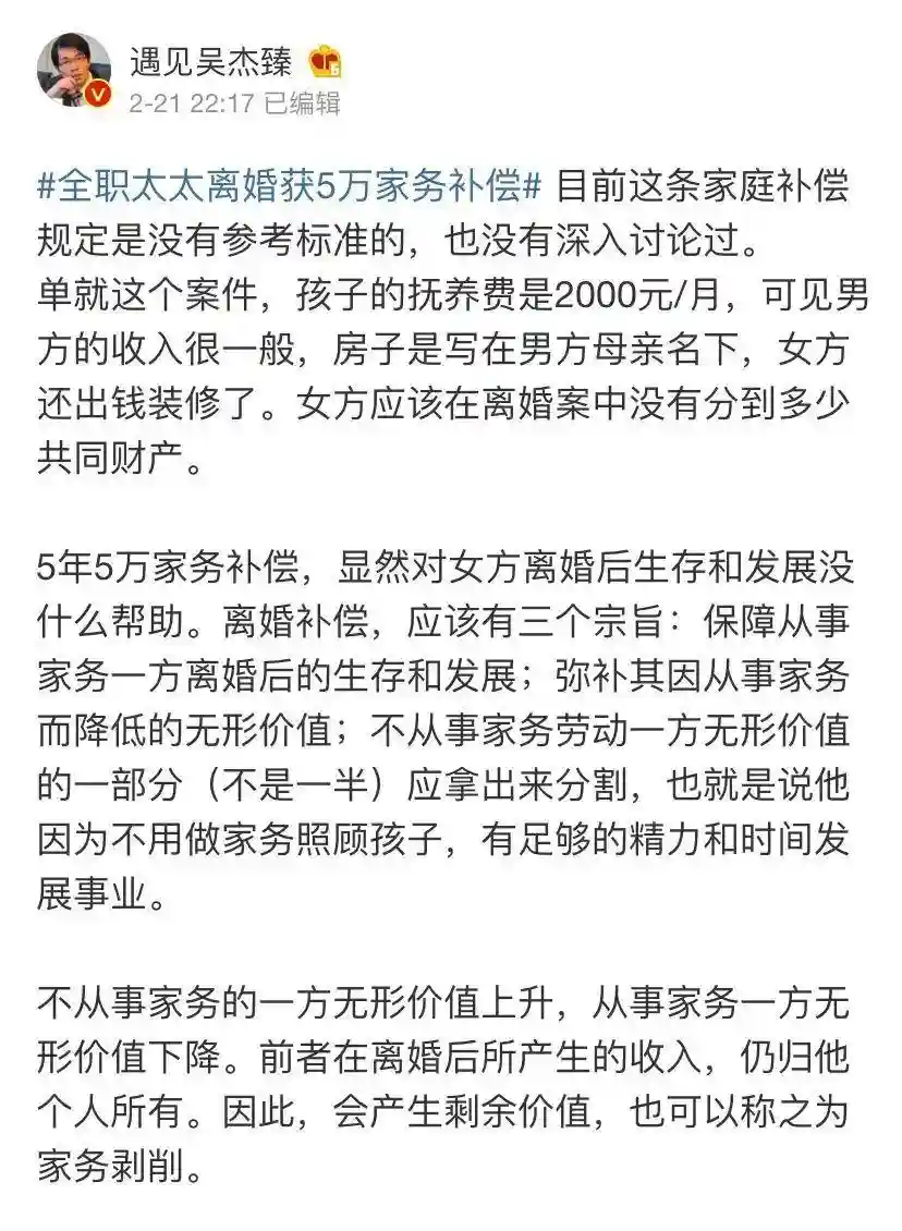 至于这个全职妈妈只拿到5万元家务补偿款到底亏不亏?应有利益有没有得到保障?我们看看专业律师的意见,在微博也看到知名婚姻律师吴杰臻点评了这个案例。