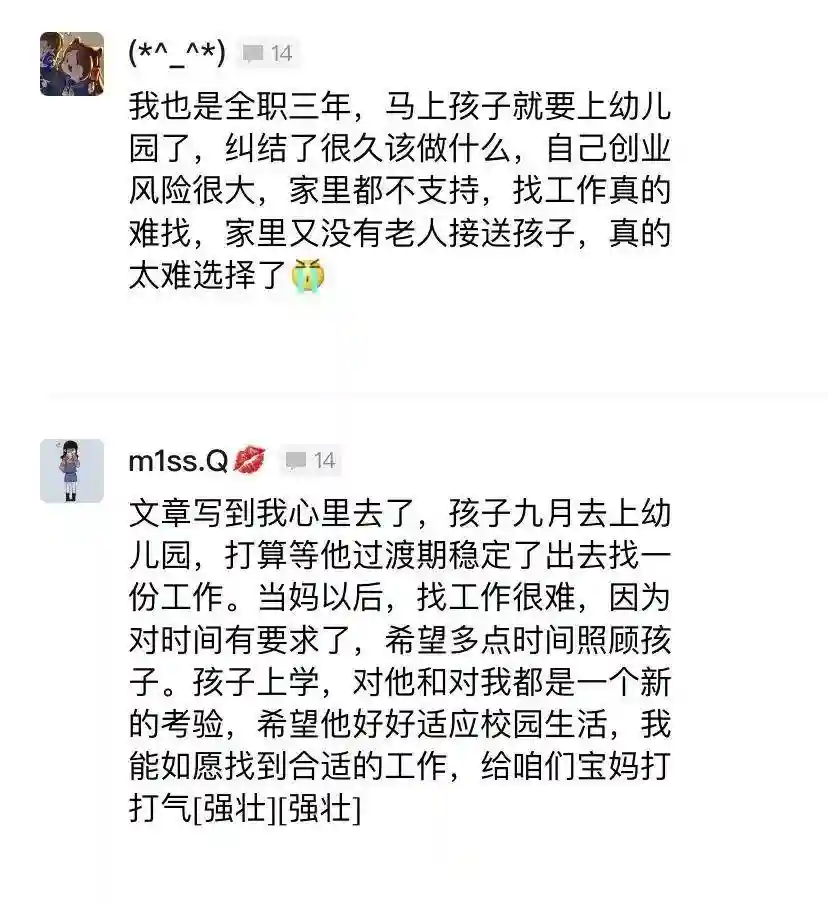 还有人觉得,全职妈妈照顾孩子和家庭放弃工作,就算补偿了几万元,也没办法弥补这几年和社会脱节的损失。
