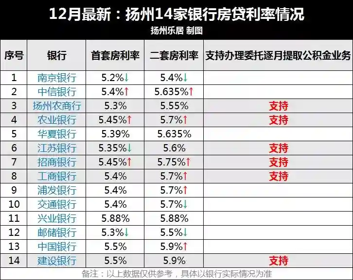 今天,乐居君整理了扬州14家银行12月份最新的房贷利率信息供大家参考,具体以银行实际情况为准。