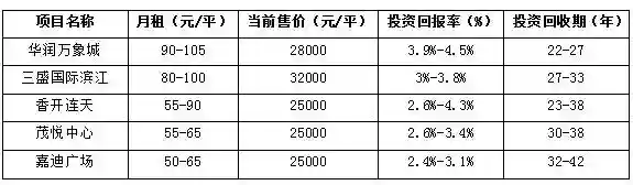 而租金回报率方面,华润万象城租金回报率相对较高,最高可达到4.5%。静态投资回收期方面,投资回收期普遍较长,22-40年不等。